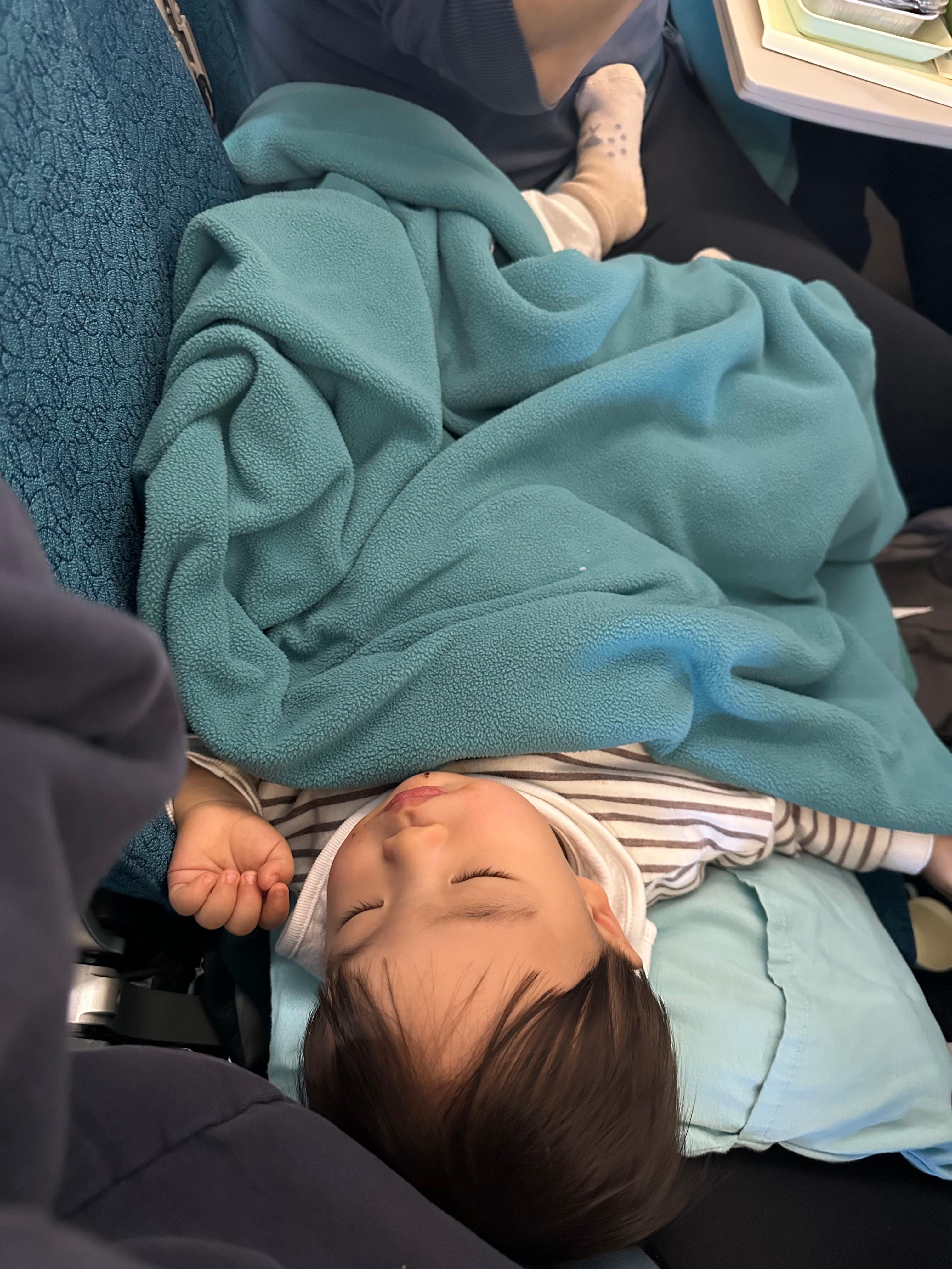 그런데.. 13개월의 강이는 키가 커서 발목부턴 베시넷 안에 들어가지 않았다 ㅠㅠ 그래서 다리를 구부리고 갔어야 했는데 불편해서인지 한 2~30분 자다 몇번 뒤척이더니 벌떡 일어나서 추락할 뻔 한 이후론 그냥 다시 일반석으로 가서 눕코노미로 갔다. 비지니스석은 좌석과 좌석 사이 팔 거치대? 를 없앨 수 없어서 아기가 누워서 가는 게 불가했다.