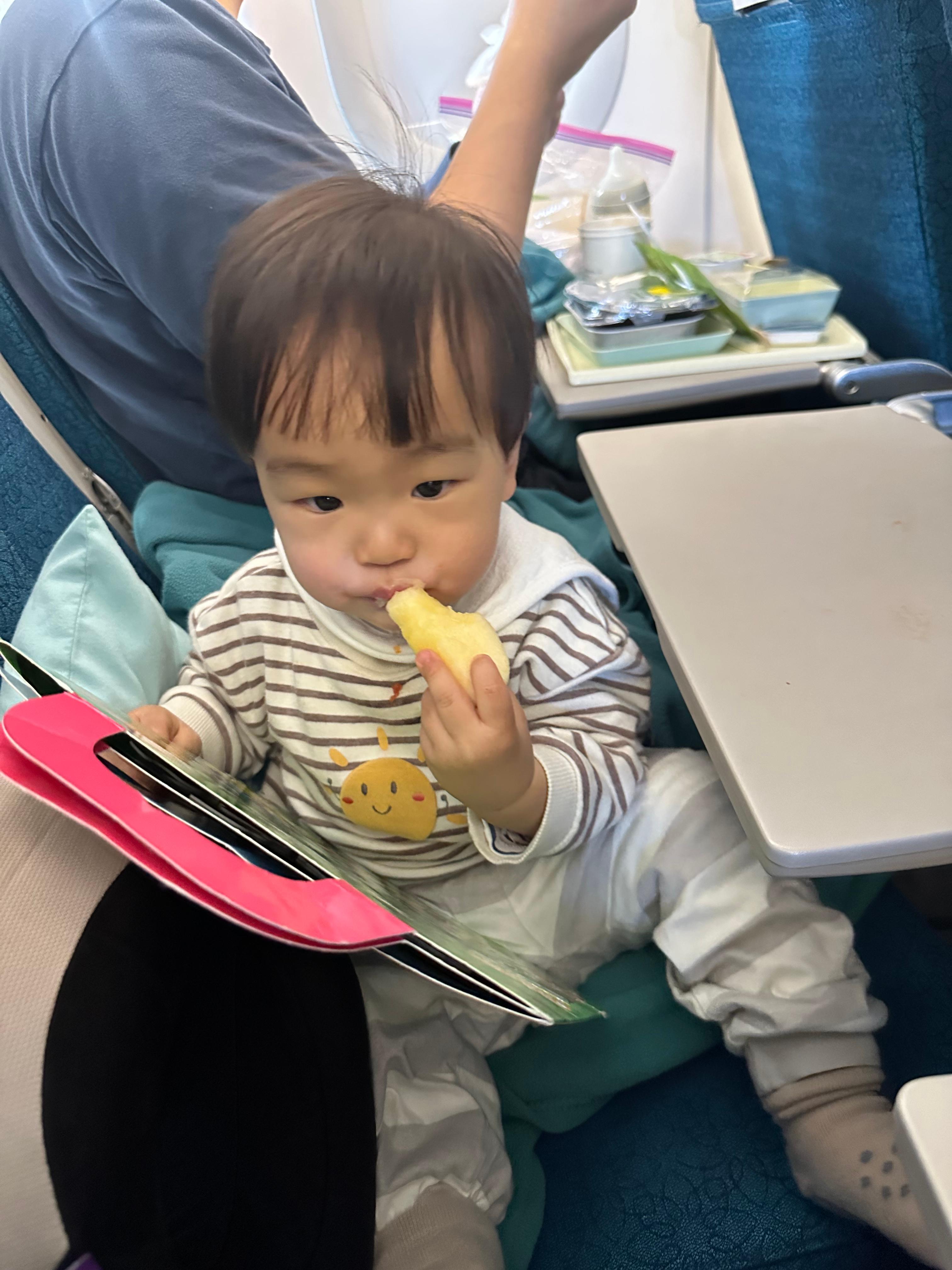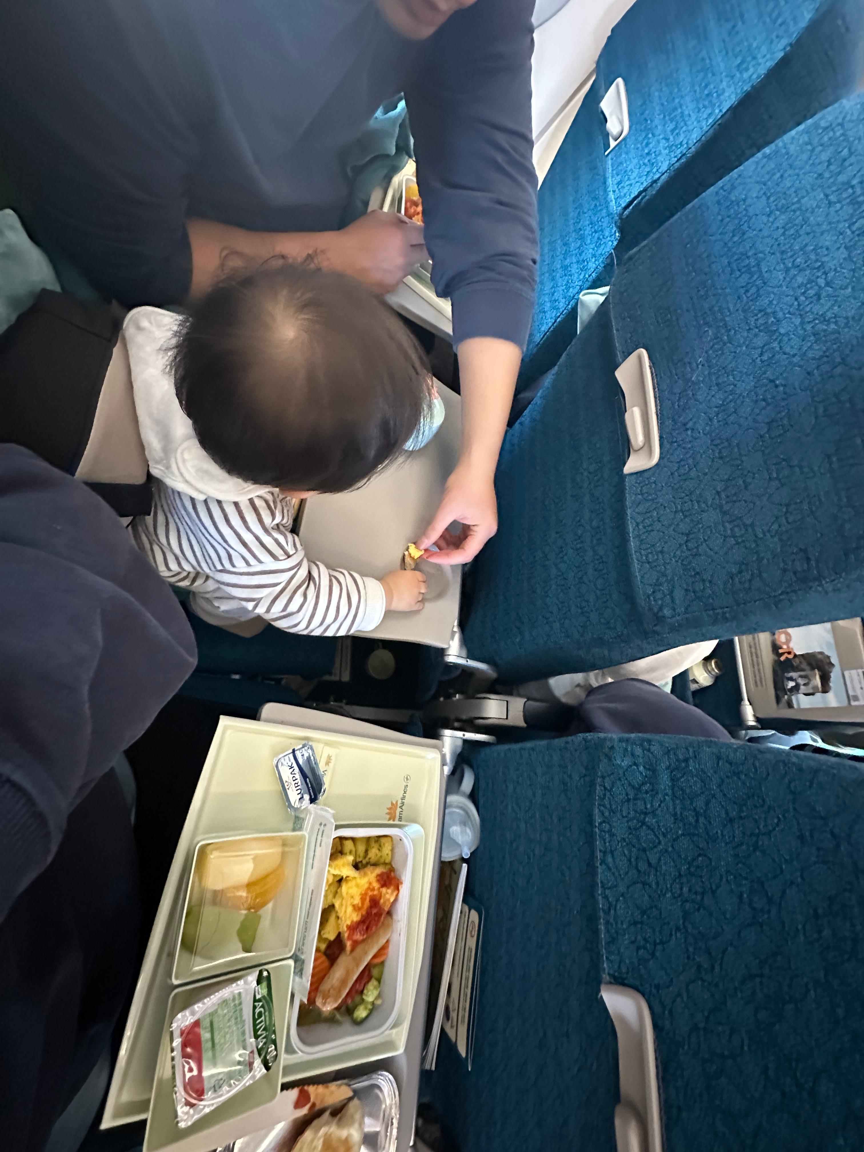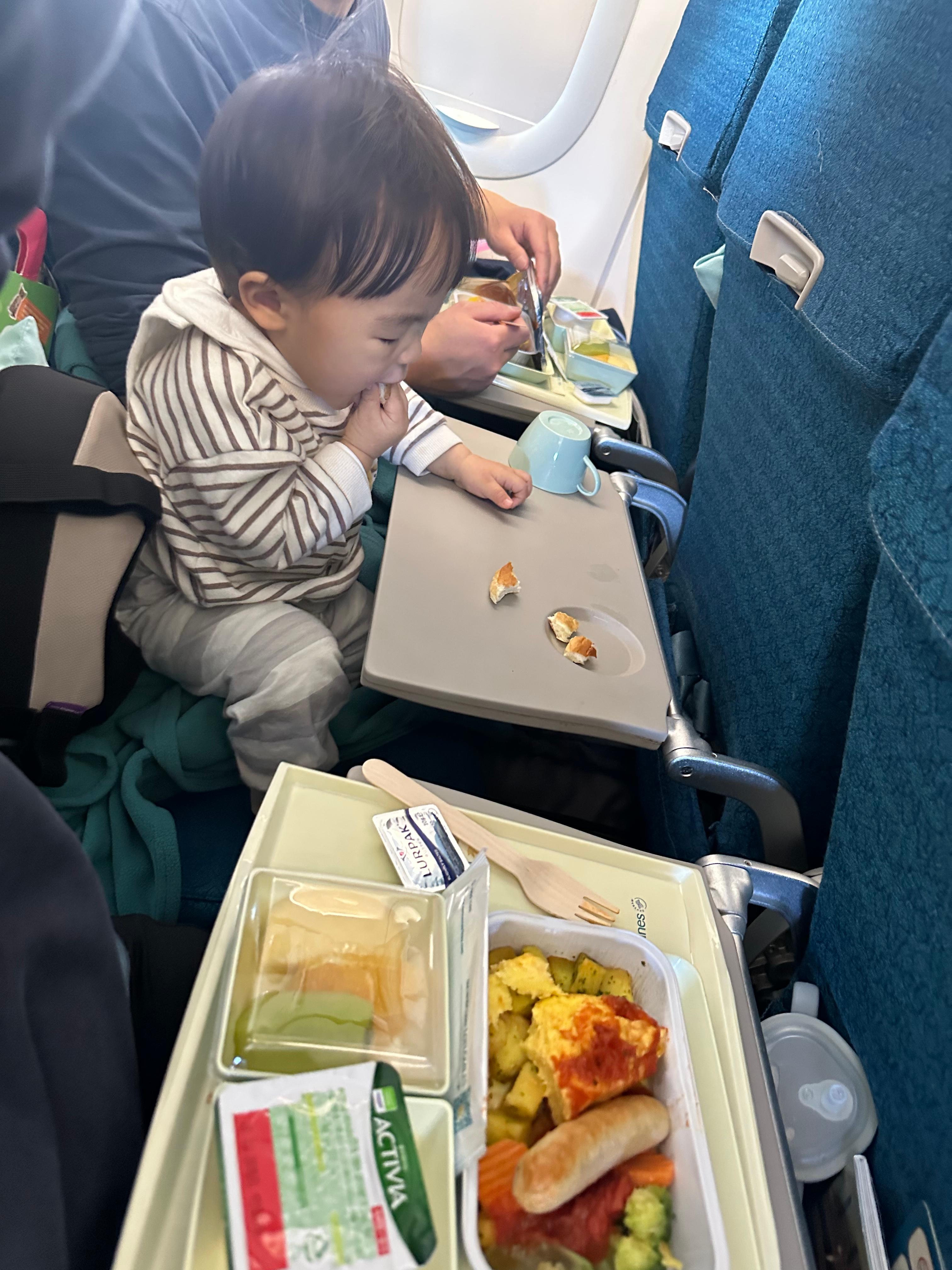 이코노미석 기내식도 내 기준 퀄리티가 괜찮았다. 무엇보다 간이 약해서 강이에게도 먹일 수 있었다. 베이비밀도 따로 신청했었는데 (사과고구마 퓨레 같은 유리병에 담아나온다) 강이는 한입 먹어보더니 거부했당 ^ㅇ^ 강이는 기내식 계란이랑 빵을 잘 드셨다.