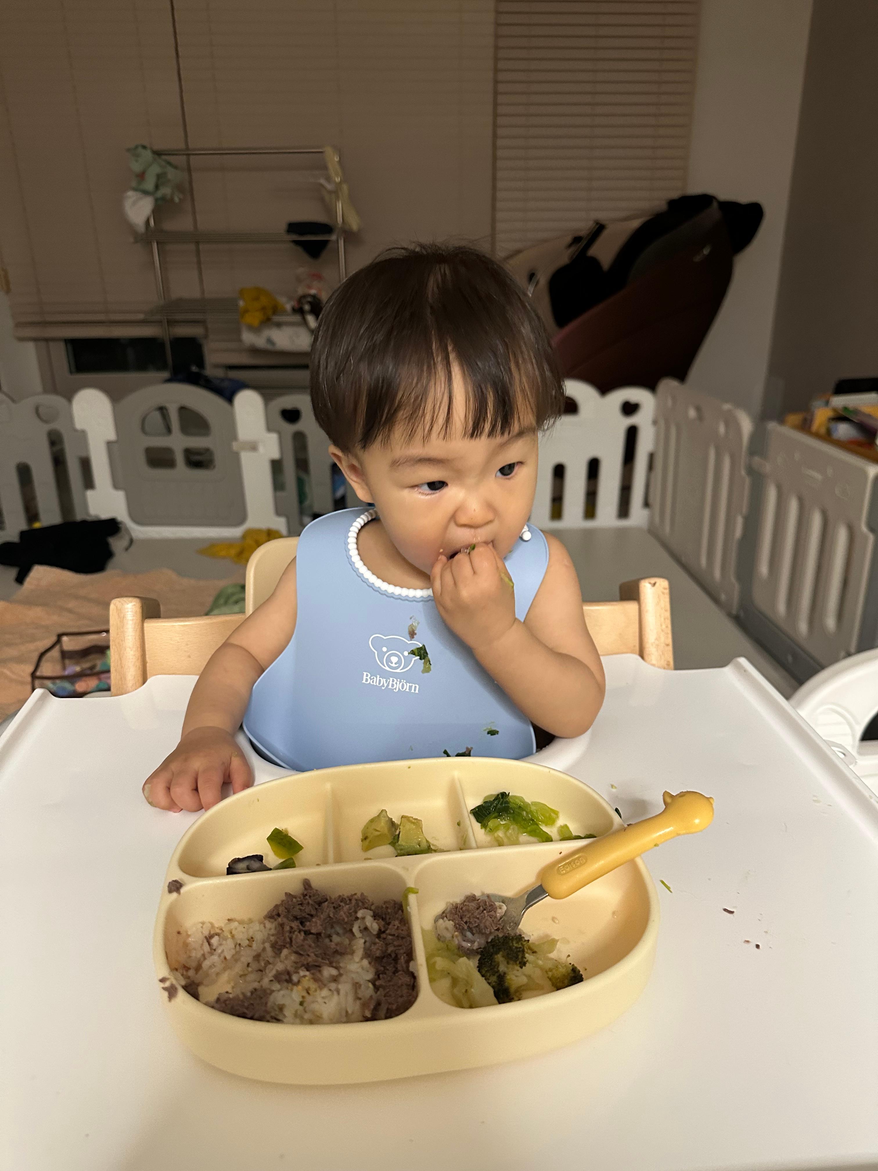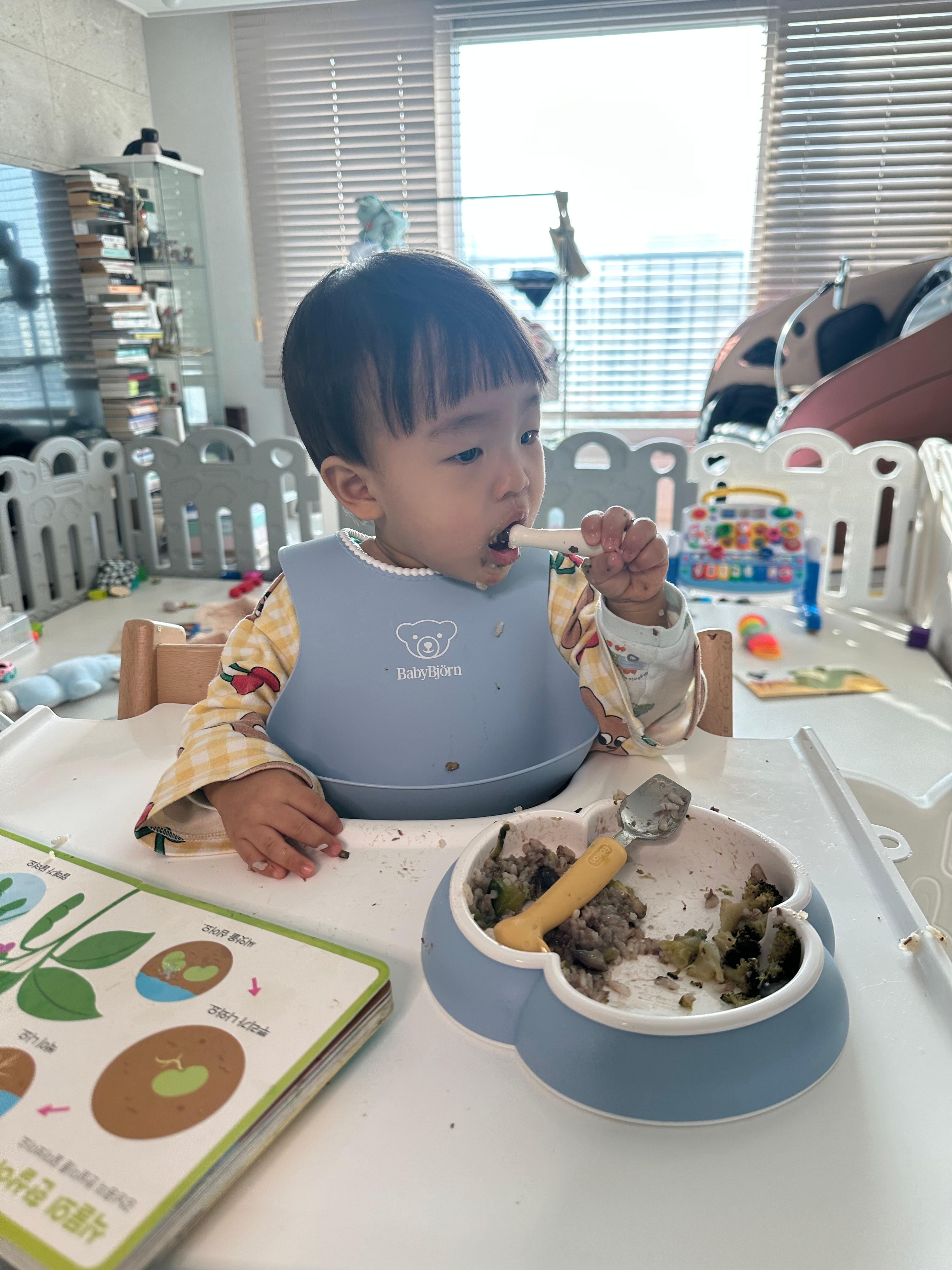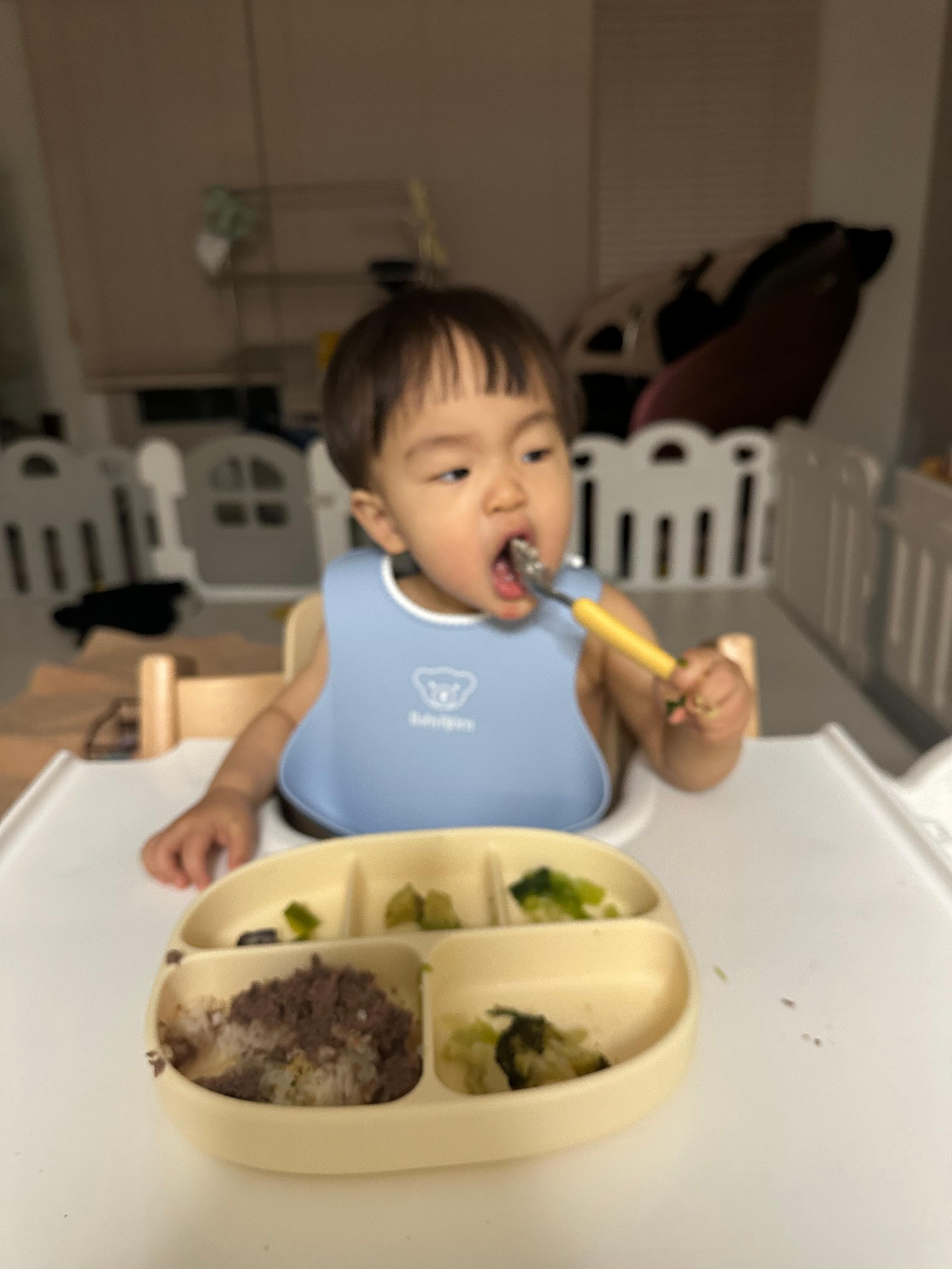 그리고. 숟가락으로 들고 먹이는 연습을 해보고 있다. 아직 스스로 뜨는 건 못해도 수저에 음식을 담아주면 들어서 입에 가져가는 것은 할 수 있다. 그래도 손으로 먹는 걸 선호해서 놔두고 있다. 이것도 때 되면 알아서 먹겄지 싶다.