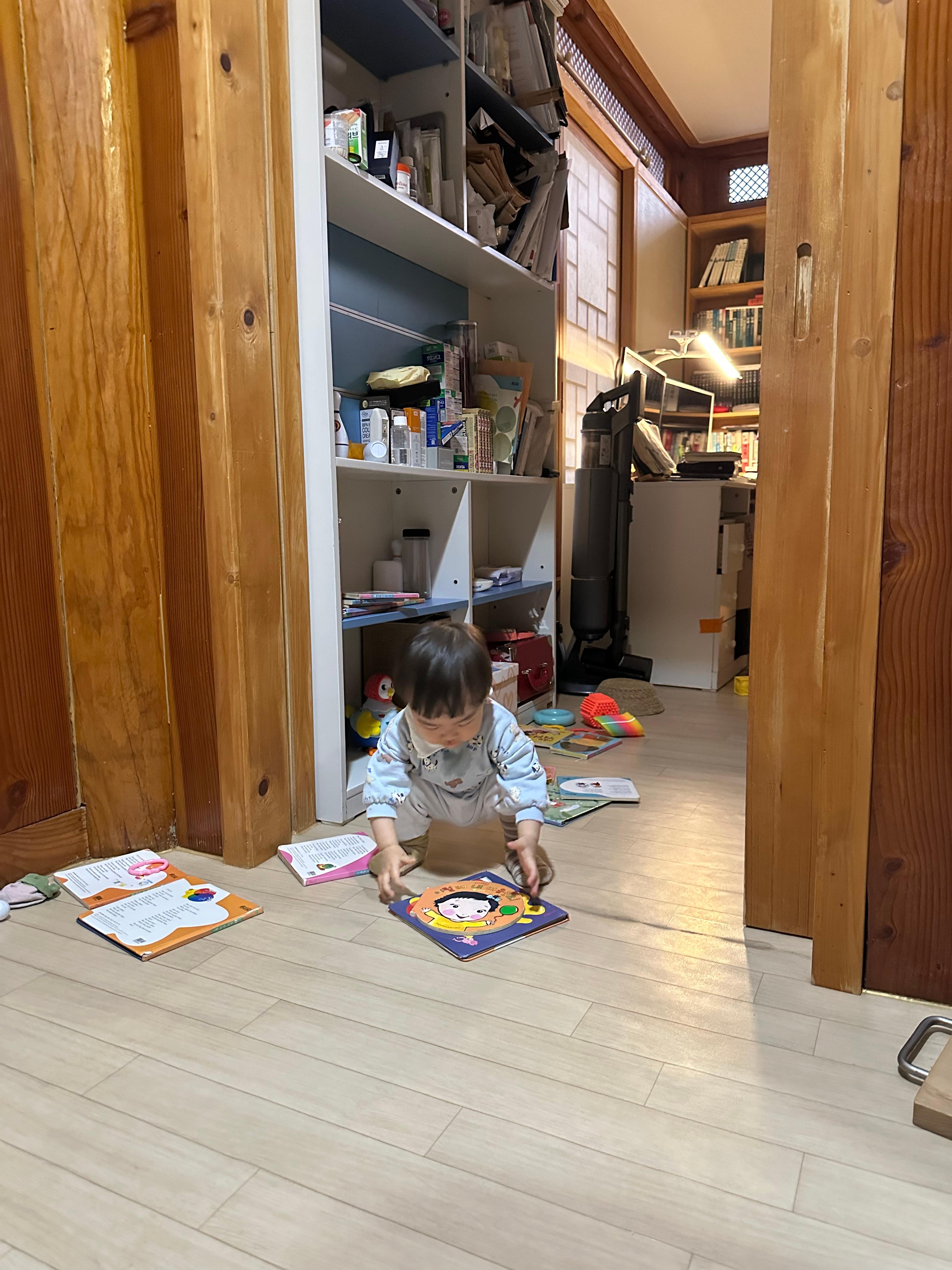 생후 357일, 걸음마를 시작했던 강이는 열흘 정도 두 손을 위로 번쩍 들고 균형을 잡으며 아장아장 걸어다녔는데(어찌나 귀엽던지) 보름이 지나니 손도 이제 어른처럼 내리고 터벅터벅 걸어다닌다. 걸음속도도 굉장히 빨라져.. 정말 한눈을 팔 수가 없는 시기가 왔다. 걸을 수 있게 되면서부터 행동반경과 시야가 넓어지고 키도 자라니까.. 식탁 가장자리에 뭘 올려두면 까치발 해서 가져가버려서, 물건 위치도 신중하게 되었다.