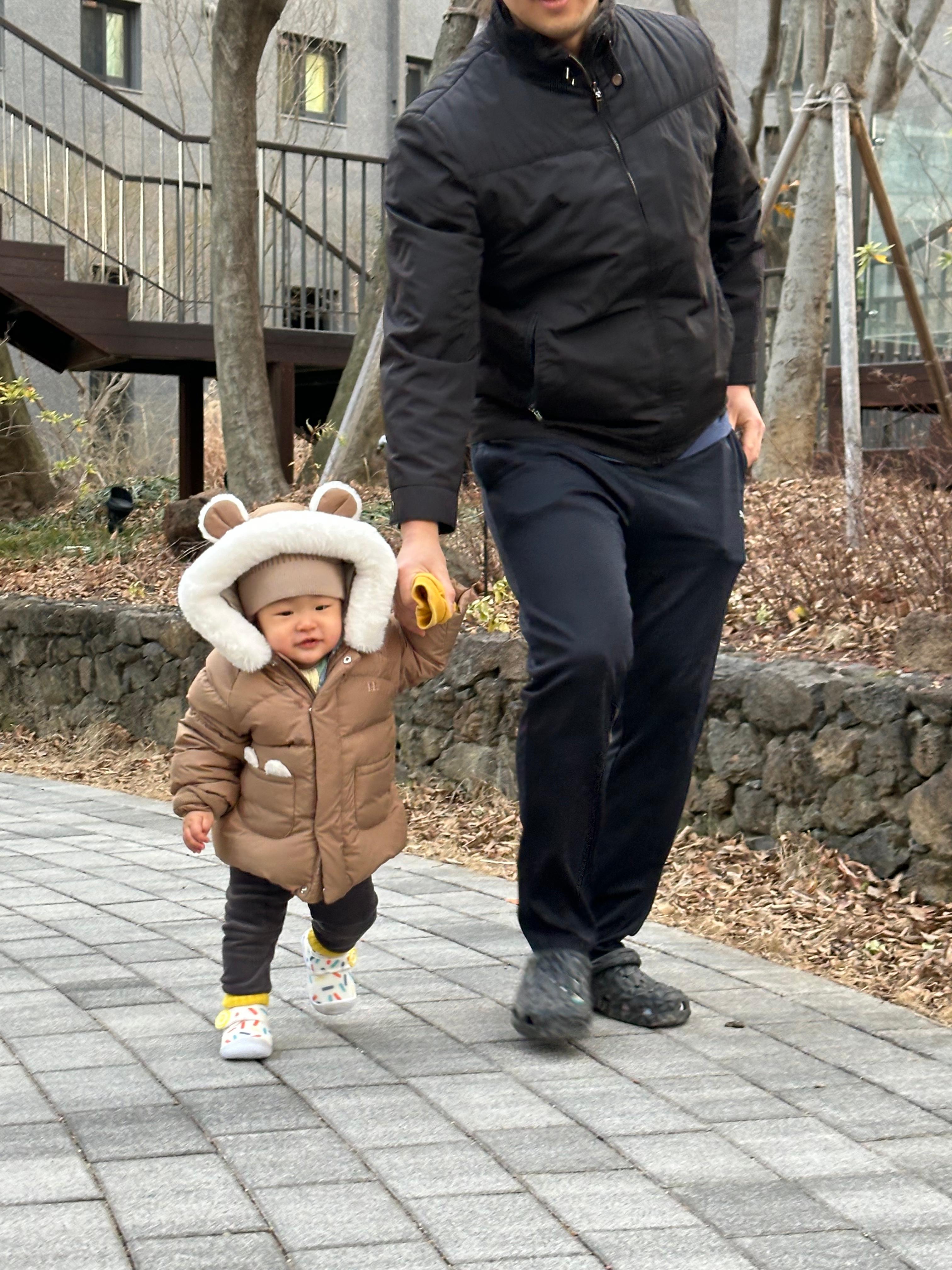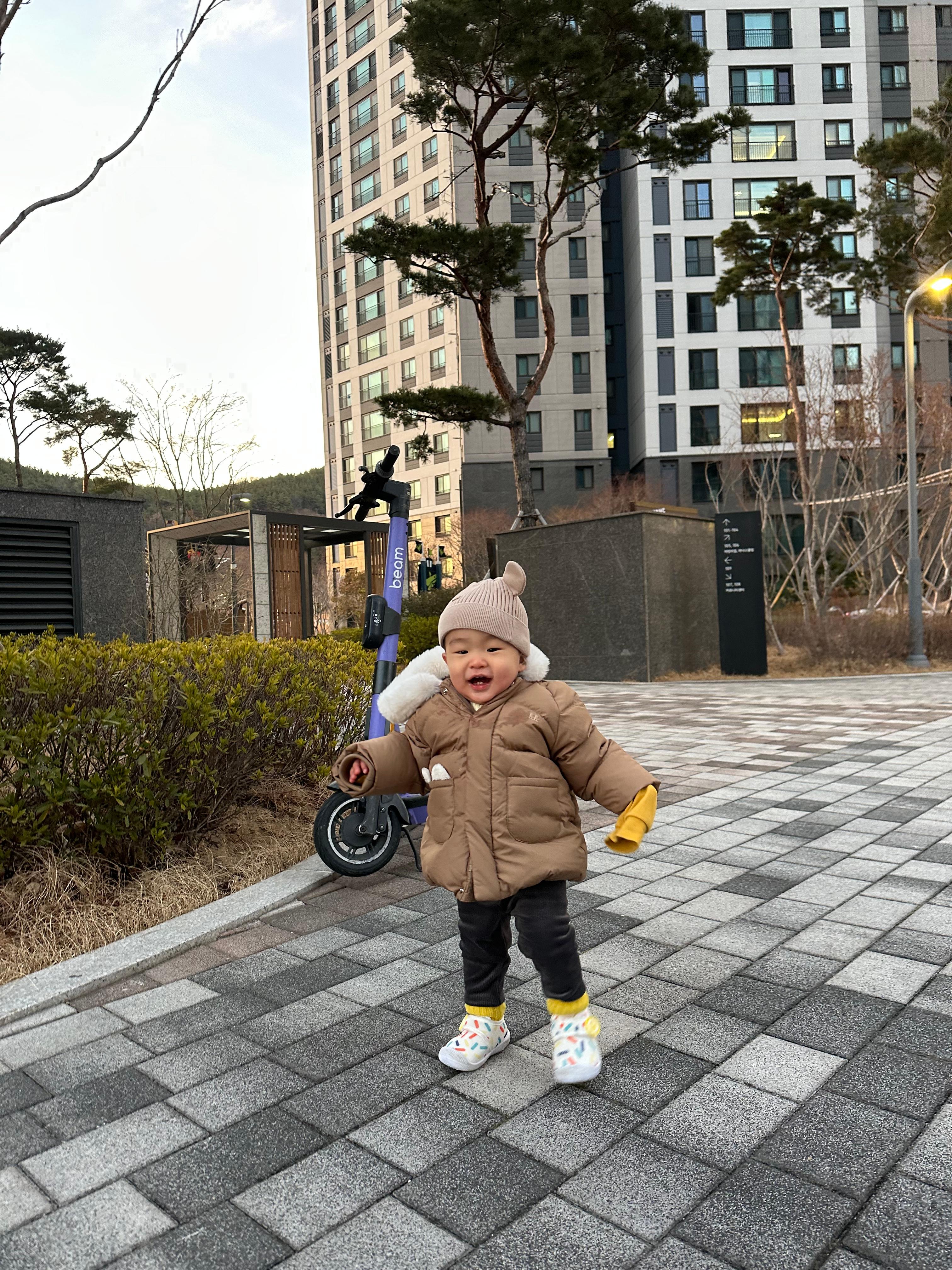 처음엔 신발이 어색해서 신발신곤 잘 안 걸으려고 했는데 이젠 신발 신고도 잘 걸어다닌다! 맨날 안거나, 유모차만 태워 산책했었는데 이제 강이 손 잡고 산책할 수 있게 되었다 ><