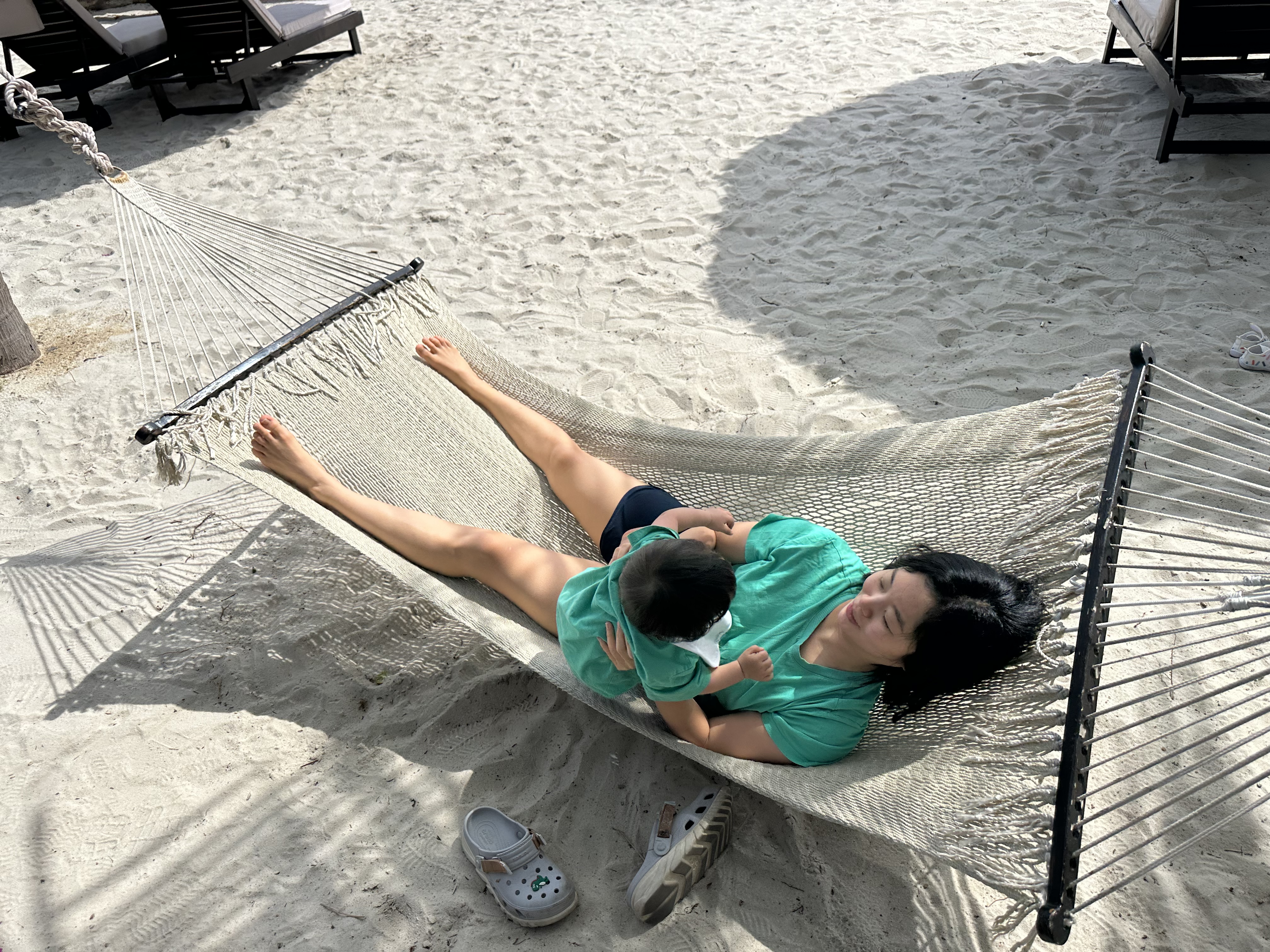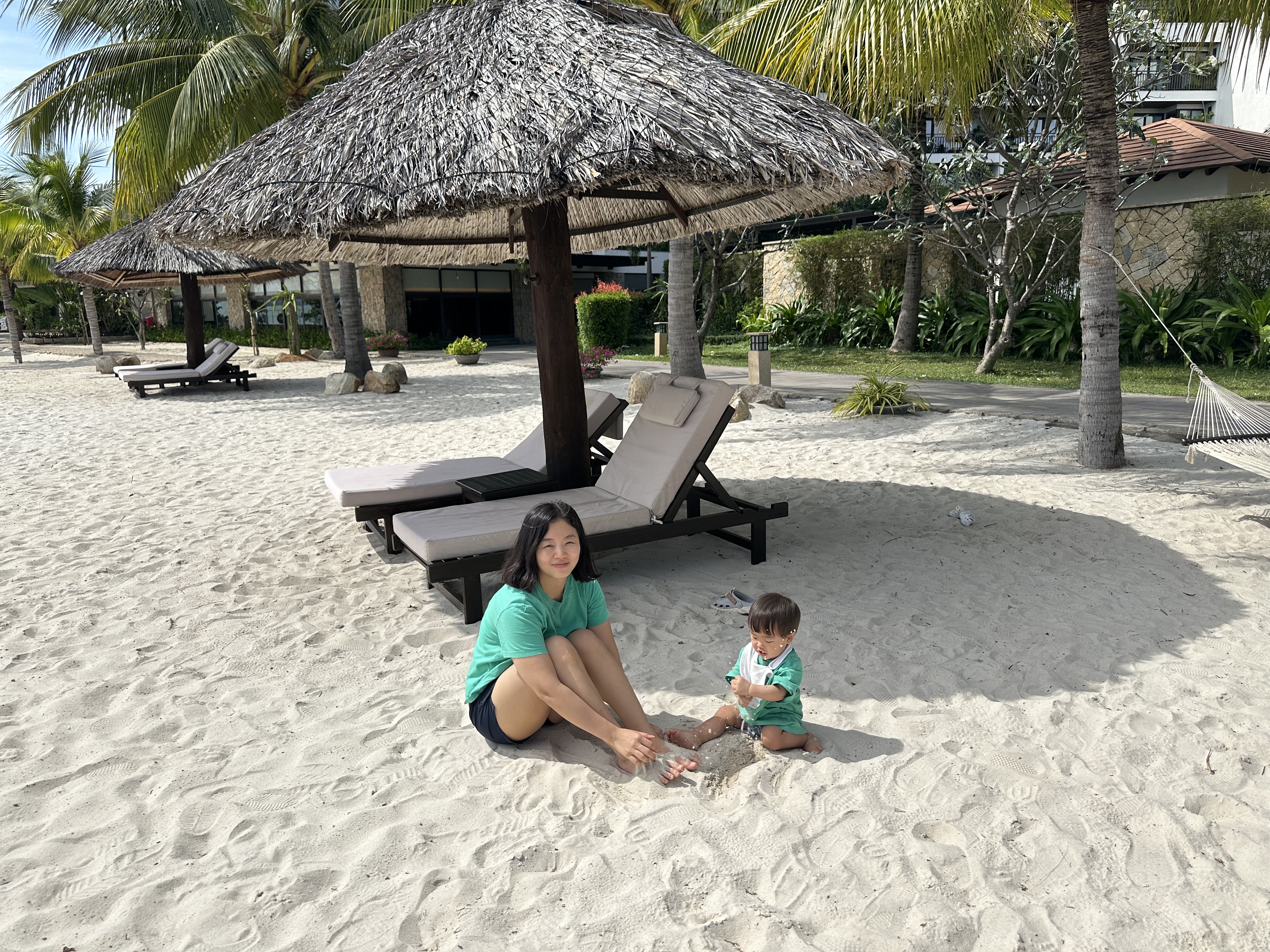 제일 좋았던 것 중 하나가 프라이빗 비치가 있어 여유로운 바다수영 + 해변산책이 가능하다는 것. 해변 곳곳에 해먹과 햇빛가리개(?)+ 의자가 있어서 좋았음. 룰루는 역시나 모래놀이에 정신이 팔렸다.